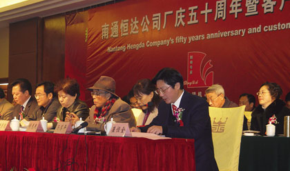 2008年11月28日,恒達公司五十周年廠慶暨四年一度的用戶聯(lián)誼會在海安王府大酒店隆重舉行,會議由海安鎮(zhèn)黨委書記盧忠平主持,中共海安縣委書記,縣人大主任章樹山致歡迎辭,來自北京、西安等地國家磚瓦協(xié)會,國家砌塊協(xié)會,國家標委會,西安墻材研究設計院的行業(yè)領導,各省市墻改辦負責同志以及國內(nèi)外用戶代表500多人出席了會議。會上公司董事長崔恒全向來自五湖四海的賓朋表示了熱烈的歡迎和衷心的感謝。在回顧公司五十年風雨的發(fā)展歷程后,又著重對今后的發(fā)展提出了戰(zhàn)略思路。隨后來自各地的用戶代表也從不同角度對恒達優(yōu)良的產(chǎn)品質(zhì)量和優(yōu)質(zhì)的售后服務一致贊譽。江蘇省墻改辦的負責人代表我省對國家的行業(yè)負責人,各省市墻改辦負責人的到來表示歡迎和感謝。同時對恒達在墻材改革所作的貢獻給予了肯定。會議結(jié)束后,與會代表乘坐大巴來到公司北廠區(qū)和新廠區(qū)進行參觀考察。中午恒達公司在王府酒店舉行招待午宴。席間藝人的獨唱雜技,以及交響演出博得賓客一陣陣掌聲。而國外用戶,伊朗帥小伙的一曲伊朗民歌將宴會的氣氛掀向了高潮。下午,全體與會負責人來到南廠區(qū)舉行技術講座和聯(lián)誼活動。這次會議是一次交流感情,促進友誼的大會。這是一次繼往開來盛況空前的大會,為公司把五十年廠慶與四年一度08用戶聯(lián)誼會有機結(jié)合起來,兩者相互交融,相得益彰,相互輝煌。這里,我們展現(xiàn)的是會議進程中一幕幕令人難以忘懷的畫面。